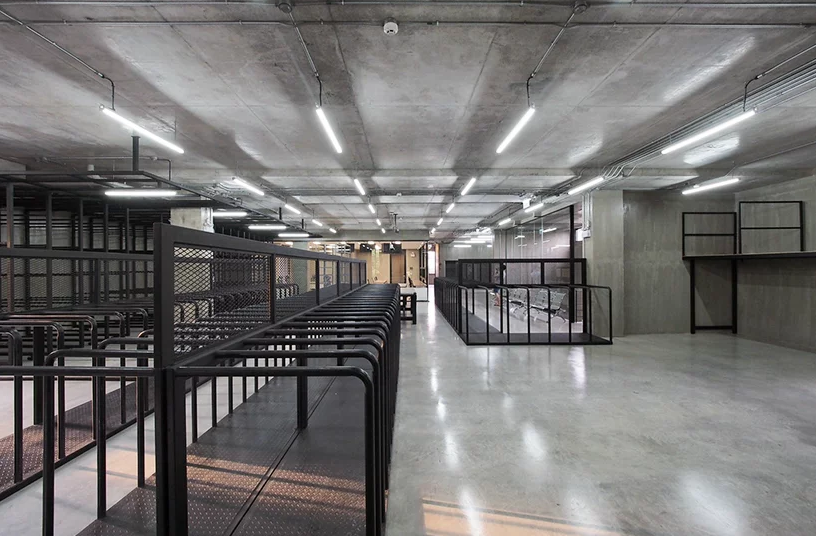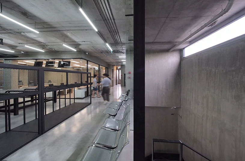 二樓辦公室裝修中充當(dāng)皮革展示區(qū)和辦公空間。每層的窗戶隔片都是可以旋轉(zhuǎn)的,而且窗戶是凹進(jìn)去的,這樣帶來的是間接的光線,不會損傷皮革制品。辦公區(qū)和展示區(qū)都是很寬大的,整體有著很濃的工業(yè)風(fēng)格。