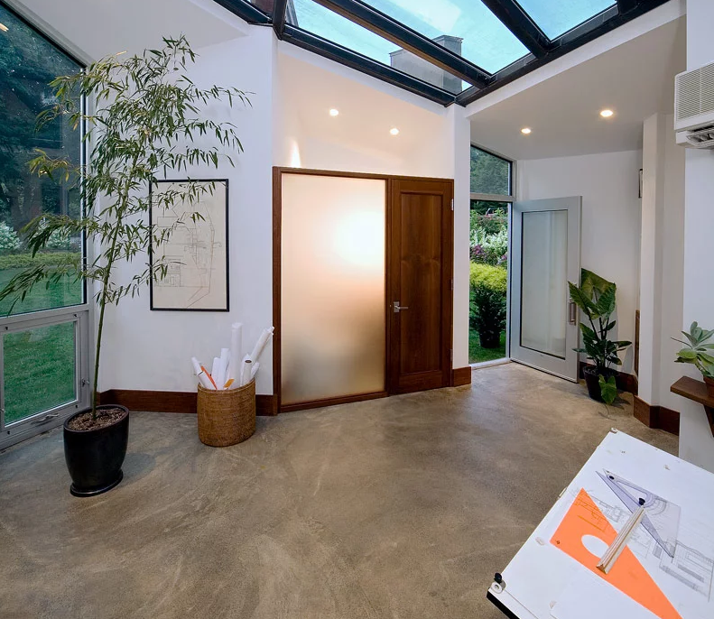在辦公室裝修內(nèi)部,valerie schweitzer建筑師創(chuàng)造了一個寬敞的鋼制和隔熱玻璃天窗,以及多個窄壁窗戶。這些辦公室裝修不僅消除了對日光的需求,而且營造了一種開放的氛圍,用戶可以在藝術(shù)生產(chǎn)過程中反思不斷變化的天空,同時感受外界的強烈隱私感。此外,辦公室裝修密封的澆筑混凝土地板,其中包含熱管道,允許工作臺和設(shè)備在整個工作室輪流和完美的配置