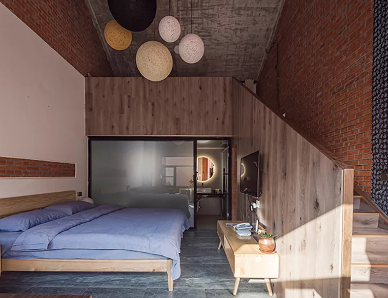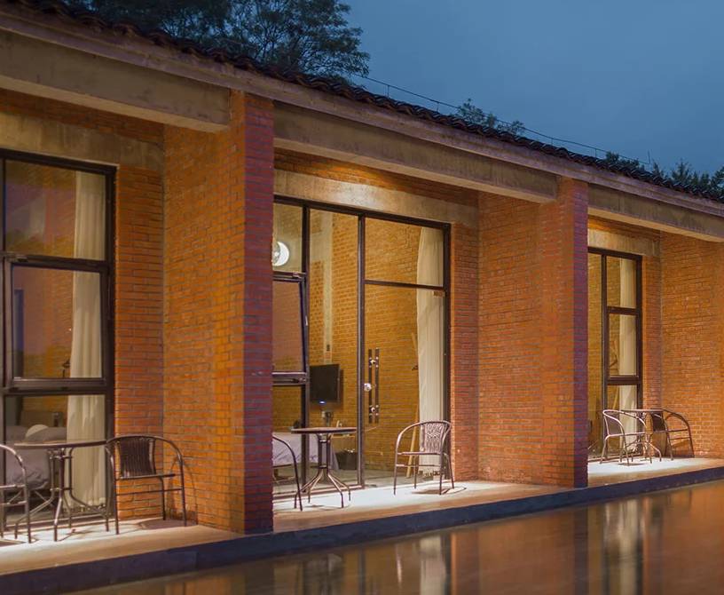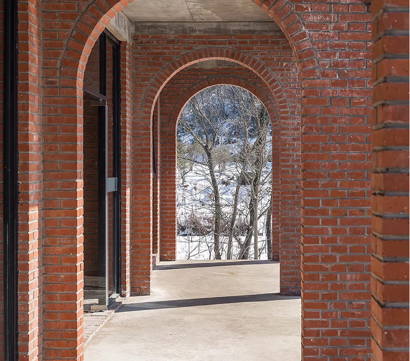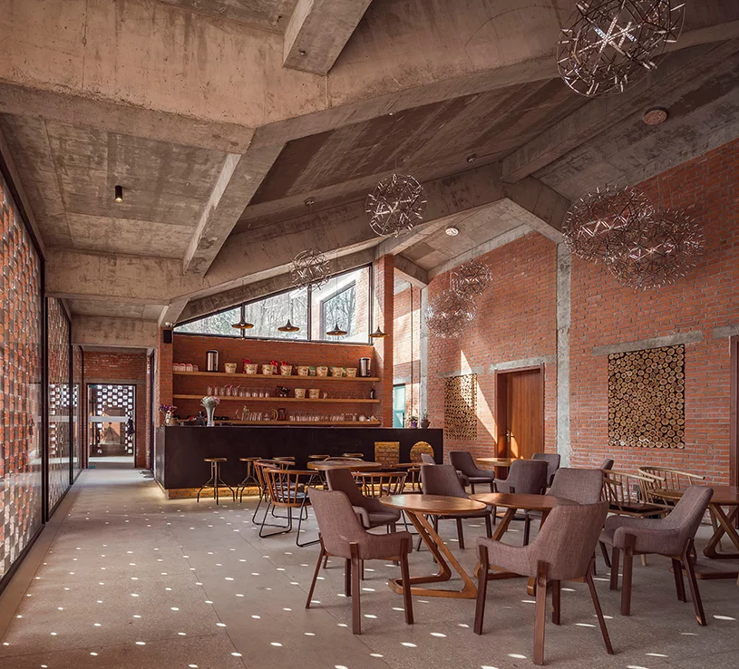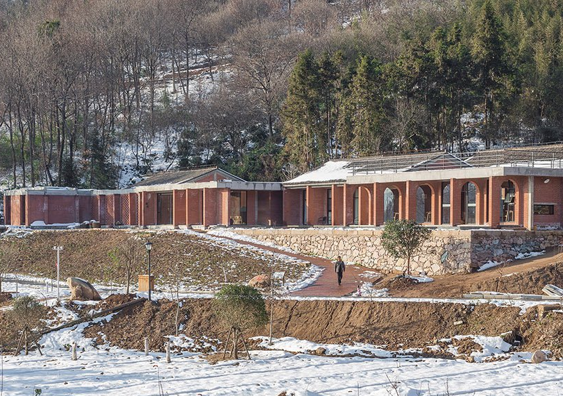 該大樓是大別山戶外露營公園的重要組成部分,酒店裝修包括客房,咖啡廳,茶館和禮堂,可用于公共聚會和培訓項目,以及冥想空間。建筑師認為,中國傳統(tǒng)建筑中最具吸引力的部分是房屋,庭院和道路之間的關系,因此功能是通過多層途徑交織在一起的。不同空間特征的私密庭院是交叉的建筑物,而復雜甚至隱藏的路徑鼓勵游客在場地周圍找到自己的方式。該建筑的主要材料是紅磚,通常在20世紀80年代使用。水磨石地板和室內墻壁上的外露材料增添了設計師想要喚起的田園感。