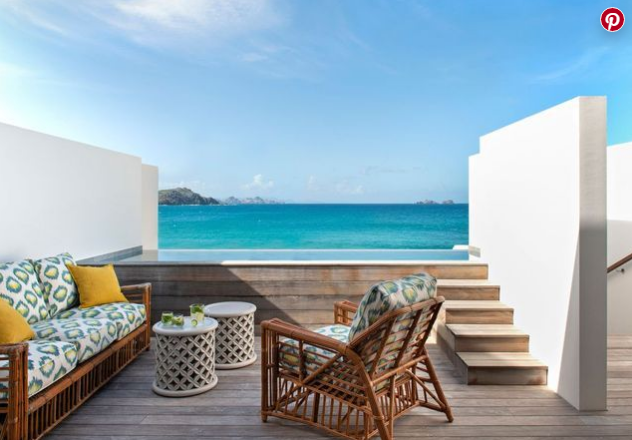 客房休閑區面向大西洋,連接露臺和睡眠區。由馬賽克藝術家Delphine Messmer,柳條扶手椅(Serena&Lily)的咖啡桌。在地面上,編織棕櫚墊(Beauvais Carpets)