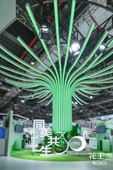 本屆進(jìn)博會(huì)上,花王向世界展示“同美共生”的美好愿景,并在現(xiàn)場(chǎng)展館的搭建上別具新意,打造了象征世界萬(wàn)物和諧和持久生命力的“同美共生之樹(shù)”,全方位、多角度、立體化展示花王基于ESG視點(diǎn)不斷展開(kāi)的實(shí)踐活動(dòng)。在展區(qū)設(shè)置上,圍繞“同美共生”愿景體系下三大重點(diǎn)領(lǐng)域——“和美自然”、“予美生活”、“創(chuàng)美未來(lái)”,分別呈現(xiàn)花王在多領(lǐng)域持續(xù)推進(jìn)的創(chuàng)新舉措,為觀眾帶來(lái)充滿(mǎn)科技感與前瞻性的創(chuàng)新盛宴。